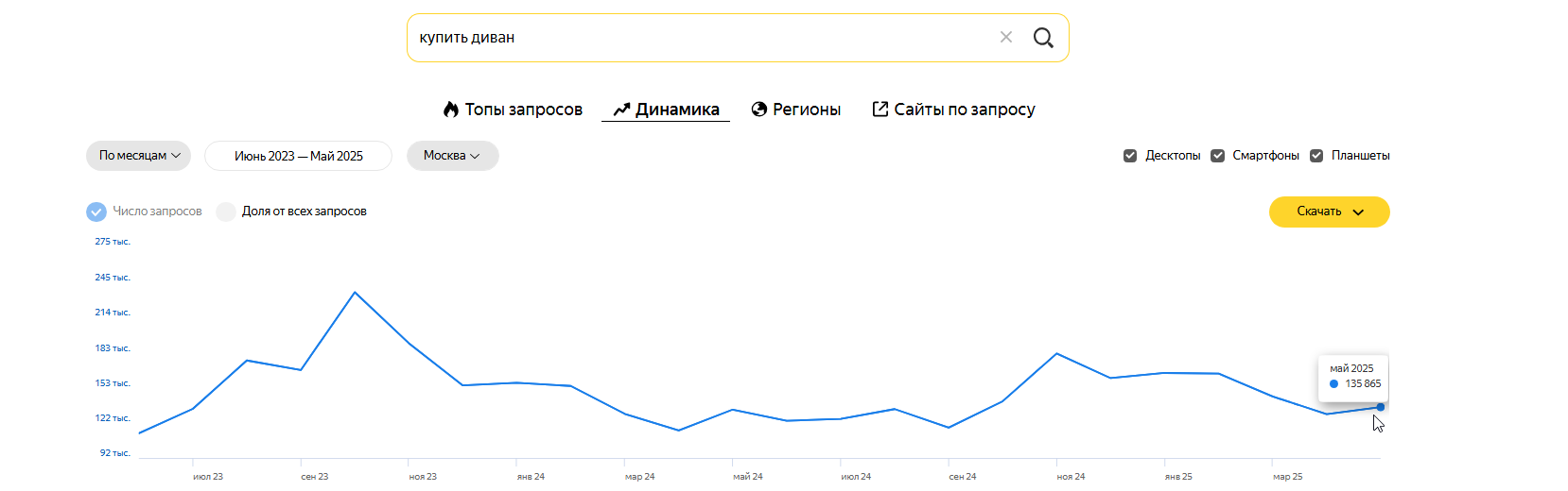 По статистике сервиса Яндекс.Вордстат, в мае 2025 года пользователи вводили запрос «купить диван» 125 тысяч раз.